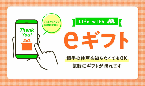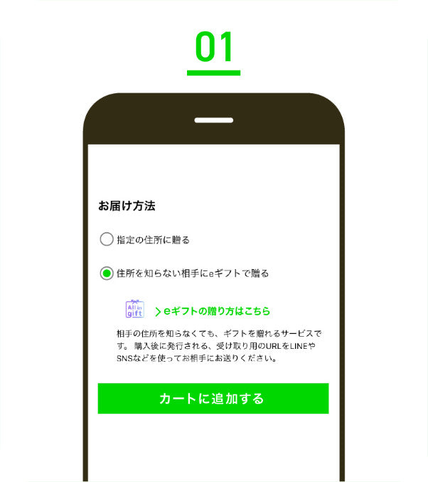 贈る商品を選び、『住所を知らない相手にeギフトを贈る』を選択し、メッセージカードを選ぶ。
