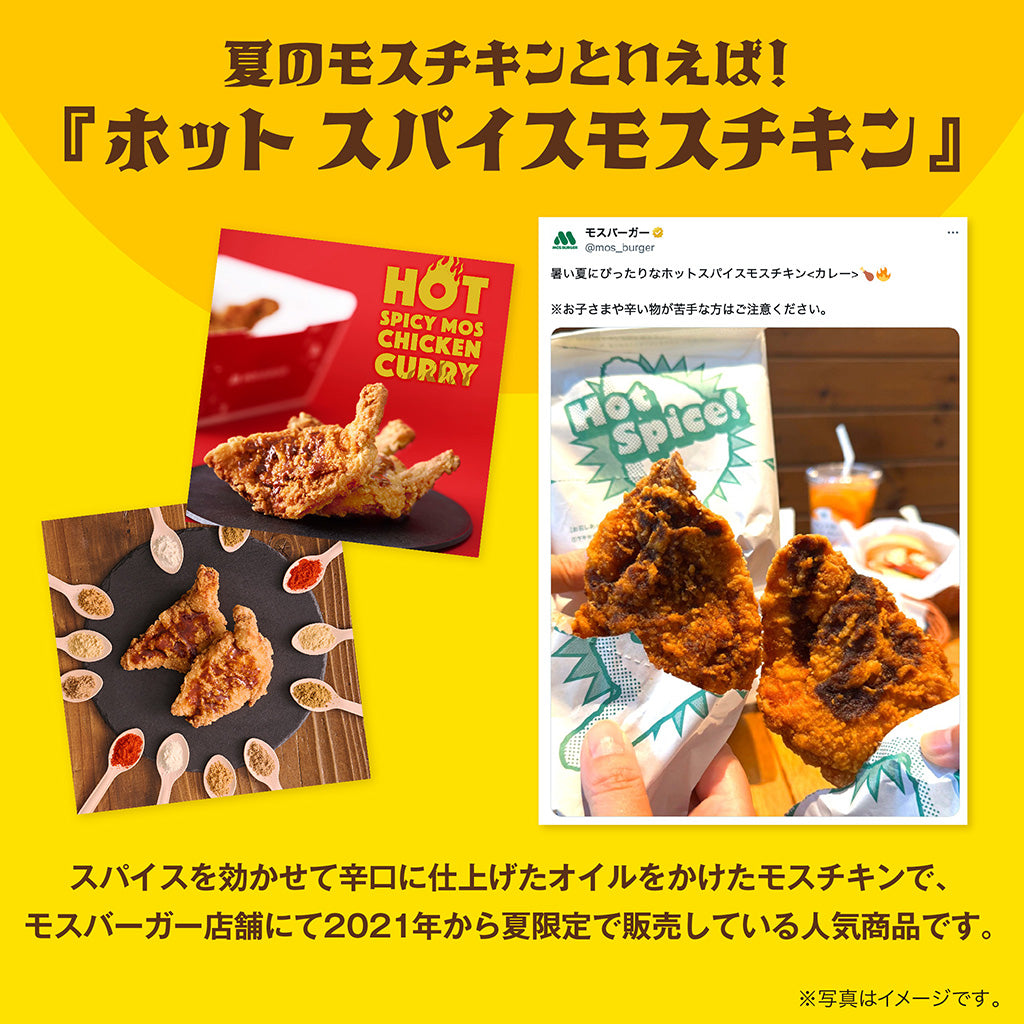 「ホット スパイスモスチキン」は、スパイスを効かせて辛口に仕上げたオイルをかけたモスチキンで、モスバーガー店舗で2021年から夏限定で販売している人気商品です。毎年、辛いものが好きなお客様から夏の定番として大変好評をいただいています。