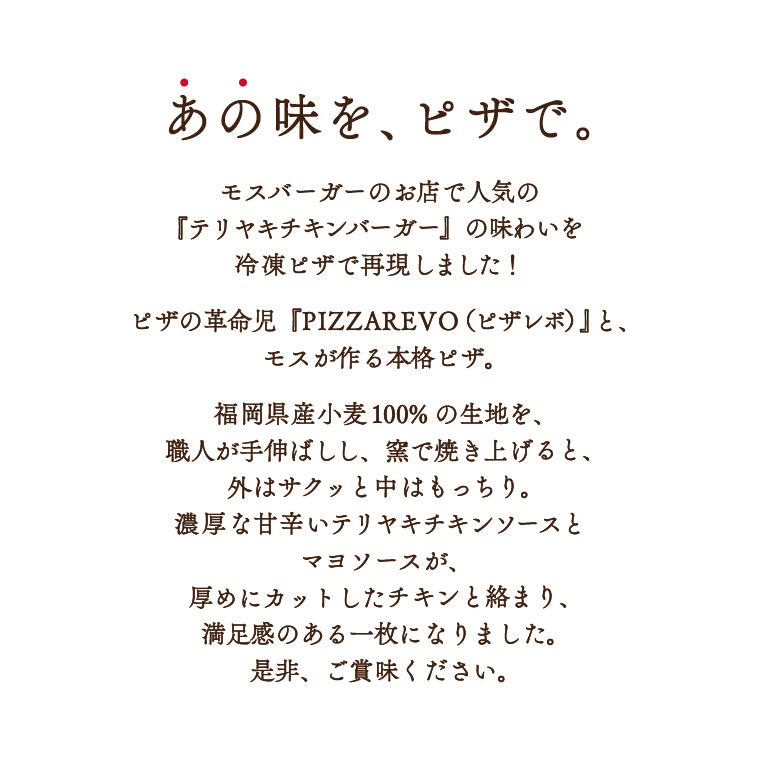 ピザの革命児『PIZZAREVO(ピザレボ)』と、モスが作る本格ピザ。福岡県産小麦100%の生地を、職人が手伸ばしし窯で焼き上げると、外はサクッと中はもっちり。濃厚な甘辛いテリヤキチキンソースとマヨソースが、厚めにカットしたチキンと絡まり満足感のある一枚になりました。