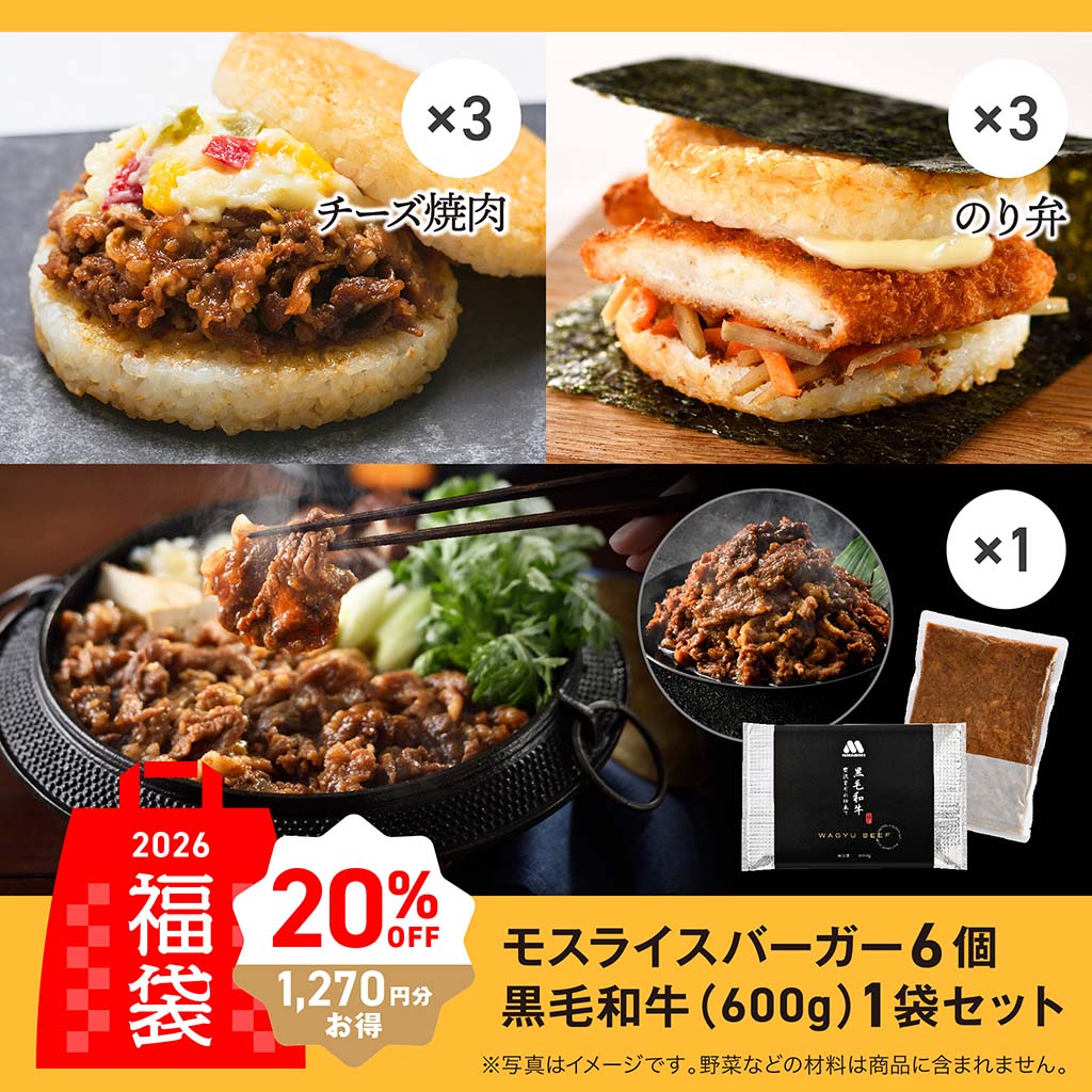 今年新登場の「黒毛和牛~贅沢旨だれ仕立て~」と、モスライスバーガーのり弁、チーズ焼肉をセットにした20%オフのお得な福袋。